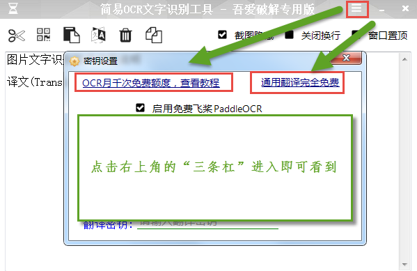 当然,软件还附带翻译功能,只不过需要去百度AI开放平台申请一下,每月1000次免费,如下图: