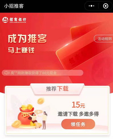 招商银行app邀请新用户有钱吗,佣金多少? 2021年4月8日 / APP拉新 招商银行邀请新用户是有拉新奖励的,目前一个是15元。只是邀请渠道不在招商银行APP内,而是在微信小程序。 招商银行新用户拉新渠道:微信搜索“小招推客”,进入即可开始拉新了。奖励和提现都是秒到的。